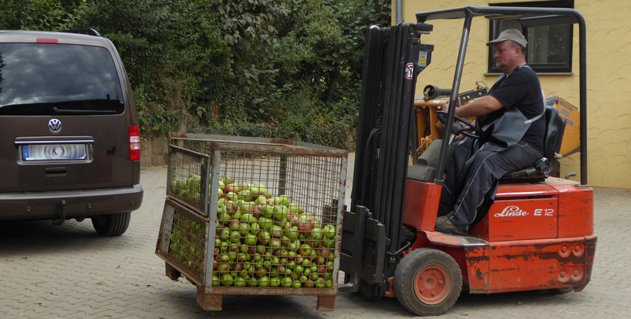 Wir können gleich da bleiben, denn in einer Stunde soll es los gehen. Die Gitterbox wird bereit gestellt und Diedrich kann die Äpfel aus den Säcken befreien. Der Gabelstapler kommt und hebt die Gitterbox erst einmal auf die Waage. Unsere erste Ernte in diesem Jahr hat ein Gewicht von 236,5 kg – nicht schlecht:-)