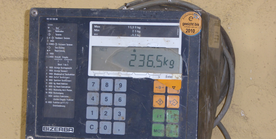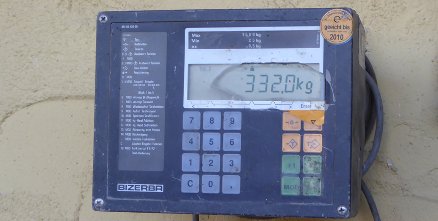 Am 5. Oktober wird das Auto mit Äpfeln, Quitten und leeren Kanistern gepackt und es geht zum Lindenhof nach Hofheim. Alles kommt wieder in die Gitterbox und die Waage zeigt diesmal das stolze Gewicht von 332 kg an.
