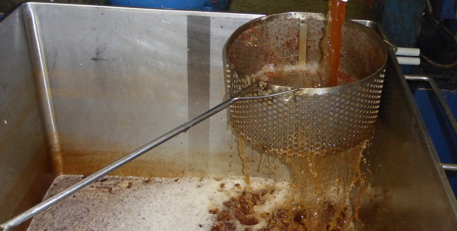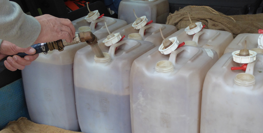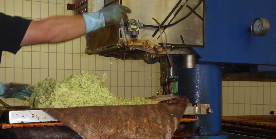 Dann kommen unsere Äpfel in die Kelterhalle. Weiter geht’s mit Waschen und Zerkleinern. Anschließend kommt der Brei in Tücher. Die werden dann in mehreren Lagen gestapelt. Das ganze wird anschließend mit viel Druck gepresst. Der Saft fließt in das bereit gestellte Gefäß und wird dann mit Hilfe einer Pumpe in unsere Behälter gefüllt. Insgesamt sind beim ersten Keltern ca. 160 l herausgekommen.