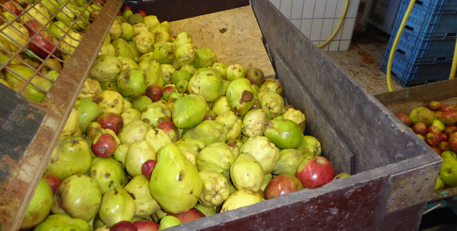 Die großen Quitten müssen noch mit der Axt zerhackt werden. Dann ist der Weg frei zum Waschen und Zerkleinern der Früchte. Nach dem Pressen können wir mit dem Ergebnis von 220 l hoch zufrieden sein.