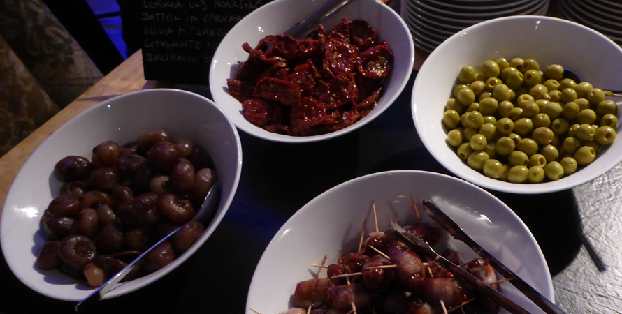 Den Lieblingsweine konnte man dann flaschenweise zu dem zwischenzeitlich von Geli und Ihrem Team aufgebauten Tapas Buffet bestellen und genießen. Das Buffet ließ keine Wünsche offen. Schinken, Käse, Oliven, herzhaftes Blätterteiggebäck. Hähnchenspieße und vieles mehr haben bei den Gästen das positive Urlaubsfeeling geweckt.
