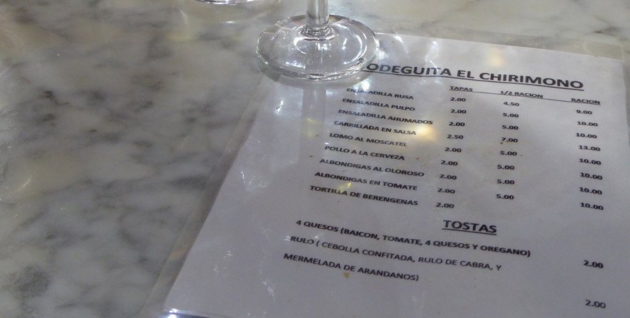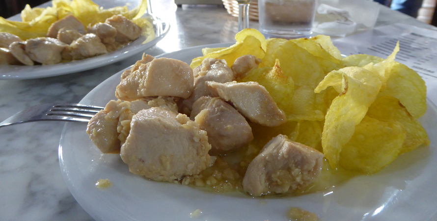 Die Karte ist klein und überschaubar. Einer der freundliche Besitzer erklärt uns was aktuell in der Küche gezaubert wurde und welche Abweichungen es in Sachen der Zubereitung gibt. Da wird schon mal aus dem Hühnchen in Biersoße eins mit Knoblauch. Meist gibt es auch noch ein Tagesgericht, das dann angesagt wird. Wenn man Glück hat und es mag, stehen da schon mal Nieren al Jerez auf dem Speiseplan, selbstverständlich in vorzüglicher Qualität. Auch das Reisgericht mit Garnelen ist ausgezeichnet. Exzellent ist der Kartoffelsalat mit Pulpo, der leicht mit geräuchertem, scharfem Paprika bestreut wird. Zum Reinknien ist die Tortilla mit Auberginen, Schinken und Käse.
