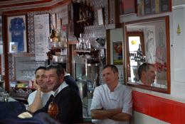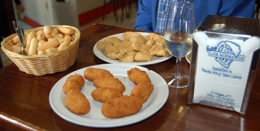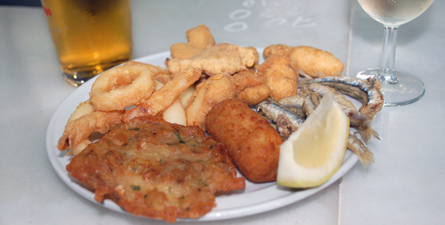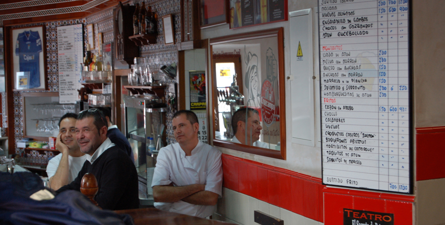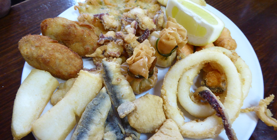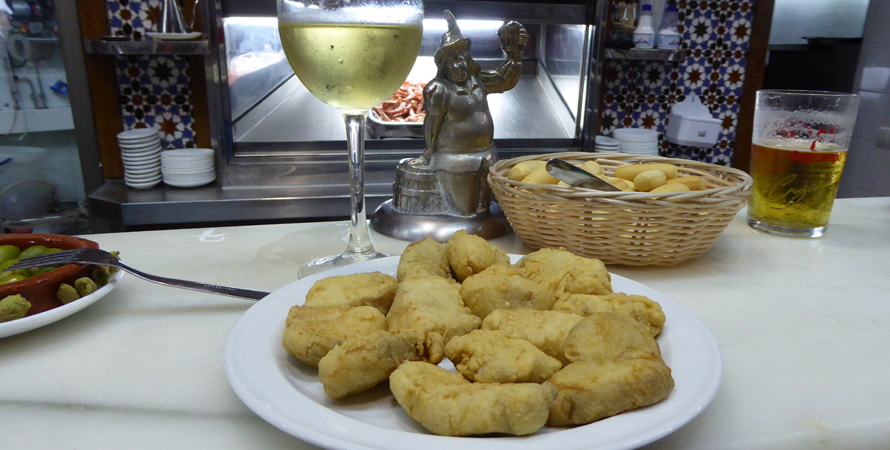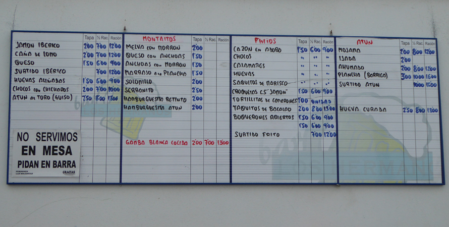 Vor Jahren entdeckt, heißgeliebt bis heute und mittlerweile von nächsten und übernächsten Generation mit Liebe und Hingabe betrieben. Spezialitäten sind frisch frittierter Fisch und Meeresfrüchte, Salate und kleine Leckereien als Tapa, 1/2 Portion oder Portion serviert. Alles was es gibt, steht auf einer Tafel. Kreide kommt zum Einsatz sobald eine Bestellung aufgegeben wird. Die Summe der Bestellung wird dann mit Kreide auf den Tresen geschrieben. Es ist voll am Tresen, man wird weiter geschoben - kein Problem - der Eintrag auf dem Tresen wird weg gewischt und an den neuen Standort übertragen. Hier kann man stundenlang stehen, genießen und fasziniert dem Treiben zu schauen.